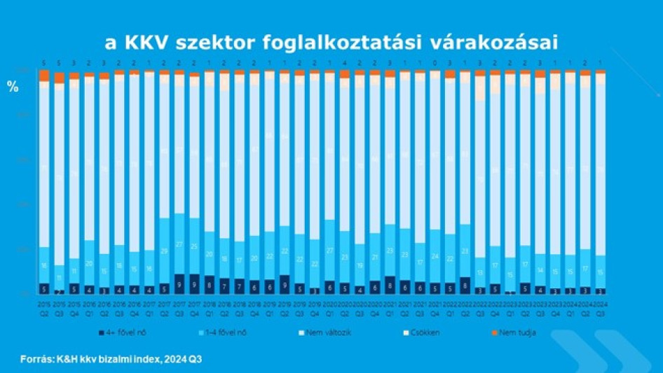 Mérséklődő optimizmus jellemzi a hazai kkv szektor foglalkoztatási várakozásait – derült ki a K&H kkv bizalmi index harmadik negyedéves kutatási adataiból. Némileg csökkent azon cégvezetők száma, akik létszámbővítésben gondolkodnak, ezzel szemben azok aránya, akik nem terveznek változtatni, 4 százalékponttal nőtt, így most 76 százalékon áll a mutató. Bár a cégvezetők közel háromnegyede tervez bérfejlesztést a következő egy évben, a béren kívüli juttatásban gondolkodók aránya 42 százalékra esett vissza, ami jelentős, 8 százalékos csökkenés. Változatlanul a tizenharmadik havi fizetés, a munkába járás támogatása, valamint a SZÉP kártya a leginkább vonzó juttatási forma.
