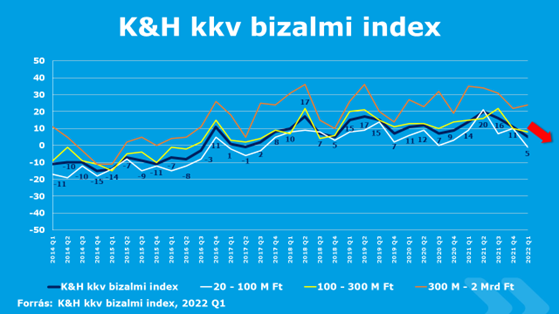 Már érzik az infláció hatását a mikro-, kis- és középvállalkozások, ám az ukrán-orosz konfliktus hatásait vélhetően még kevésbé látják – derül ki a K&H kkv bizalmi index 2022 első negyedévi kutatásából. Az index értéke még mindig pozitív, 5 ponton áll, ugyanakkor utoljára négy éve volt ilyen alacsonyan. A visszaesés hátterében több dolog húzódik: a cégek magasabb kamatokra és a közterhek növekedésére készülnek, a munkaerőpiaci helyzetet negatívabban értékelik, illetve a vállalkozásbarát kormányzati intézkedésekre számító kkv-k aránya is mérséklődött.