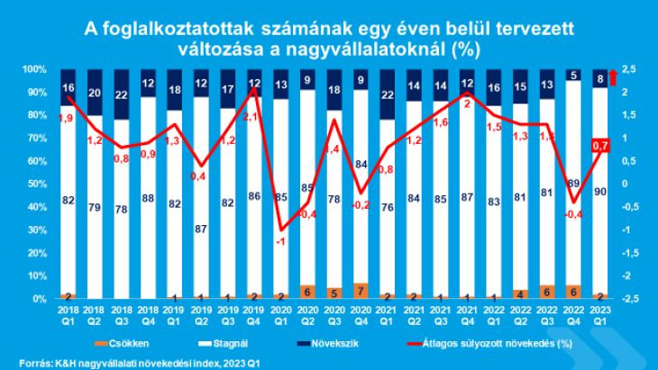 Nem kell létszámleépítésektől tartani a hazai nagyvállalatoknál, ugyanis jelentősen, 6 százalékról 2 százalékra mérséklődött az elbocsátásban gondolkodó cégek aránya. Emellett az előző negyedévi rekord alacsony 5 százalék után jelenleg a cégek 8 százaléka készül munkaerő-felvételre. A teljes vállalati szektorban így 0,7 százalékos létszámbővülés várható a következő egy évben – derül ki a K&H nagyvállalati növekedési index 2023 első negyedéves méréséből. Az egyéves tervek alapján legnagyobb eséllyel a 10 milliárd forint feletti éves árbevételű, az ágazatok közül az iparban, míg területileg a kelet- és nyugat-magyarországi cégeknél várható, hogy új kollégákkal bővülnek.